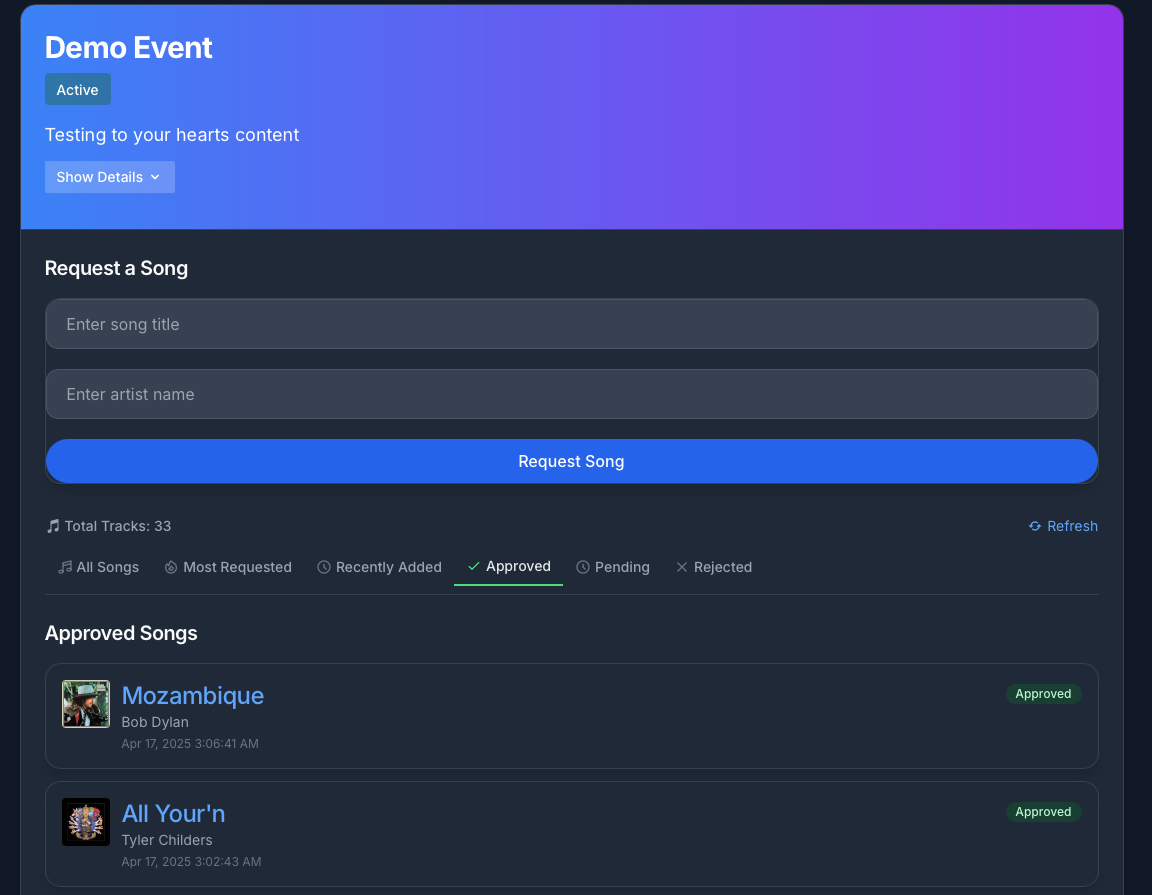 The ulitmate song requesting platform. Privacy-focused, easy to use, and built for the modern musician and event organizers.