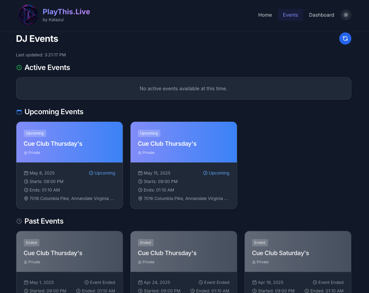 PlayThis.Live is a web-based DJ song request app. DJs create events, share a link or QR code, and guests request songs from their browser—no app download required.