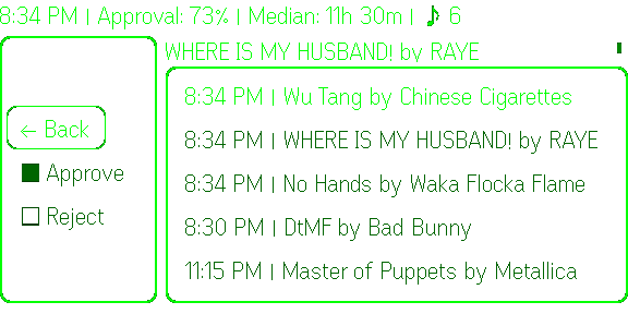Guests open your event link, search for songs, and submit requests. You see them in real time on your dashboard or on Even Realities G2 glasses. Approve, reject, or reorder the queue.